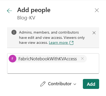 Now we can add the Service Principal to the workspace. Go to your Fabric workspace and on the top right klick on “Manage Access” > “Add people or Groups” > “Add the Service Principal”. Contributor permissions are enough for the current example.