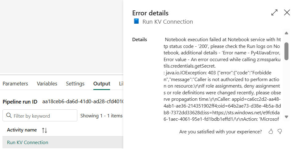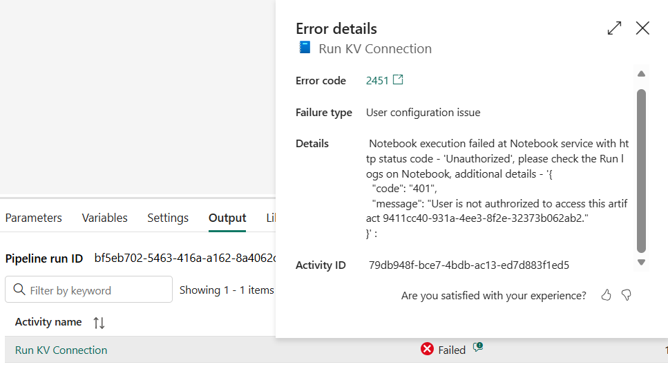 If the Service Principal is not correctly given permission to access the Notebook, an error message similar to this will show. Review that the Service Principal can access the Fabric API and is correctly given access to the Notebook.