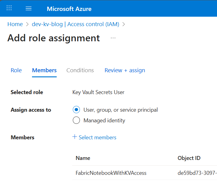 If you don’t have a Key Vault, you need to create one in your Azure tenant. The Service Principal needs to have permission to the Key Vault to read secrets. Navigate to your Key Vault and set up a new role assignment in access control (IAM). Select the role “Key Vault Secrets User” and assign it to your Service Principal.