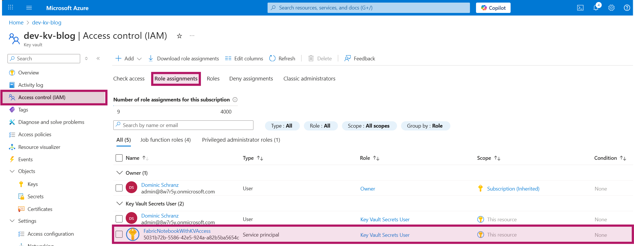 The role assignment can be validated on the “Role assignments” blade in “Access control (IAM)”: