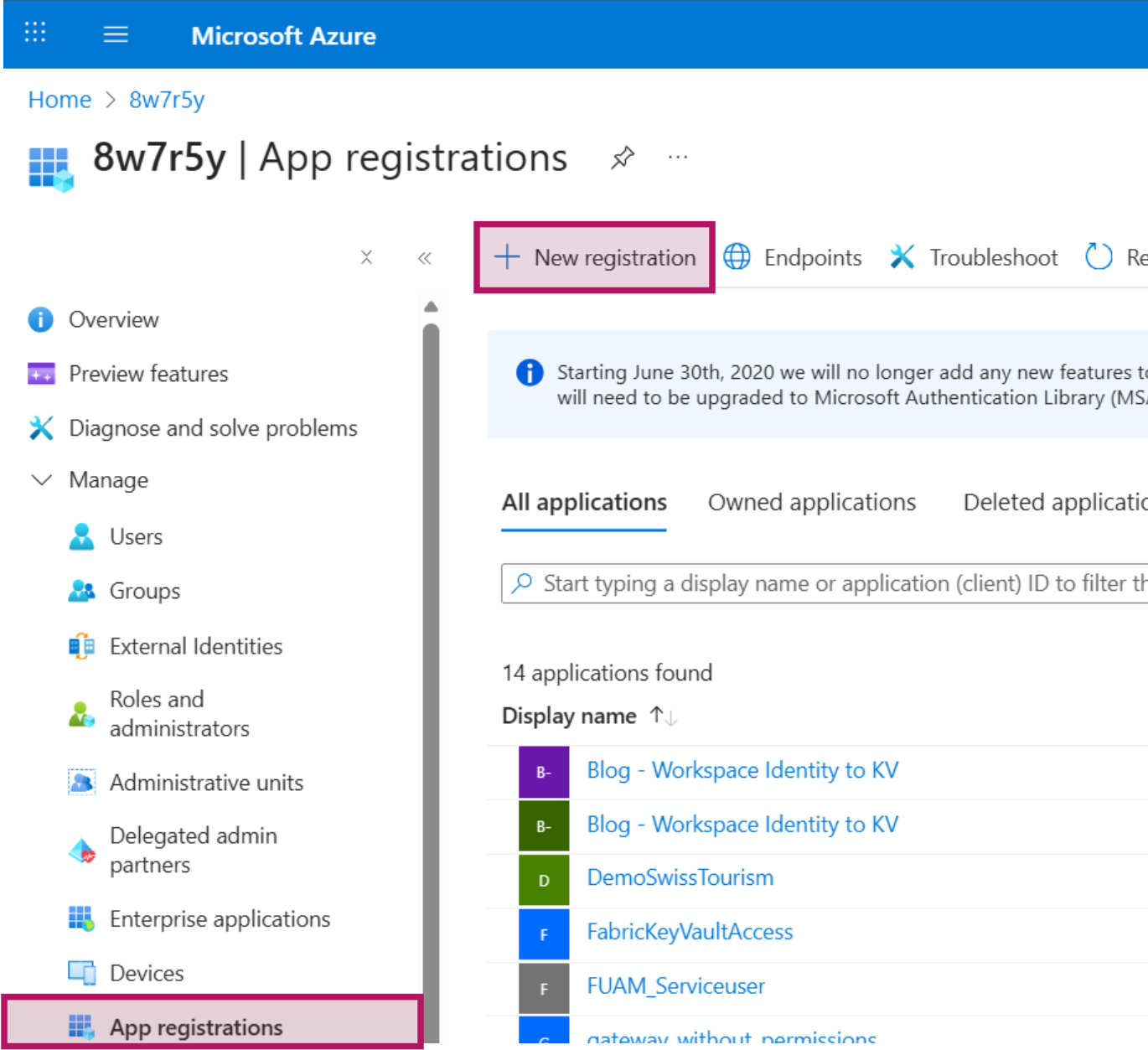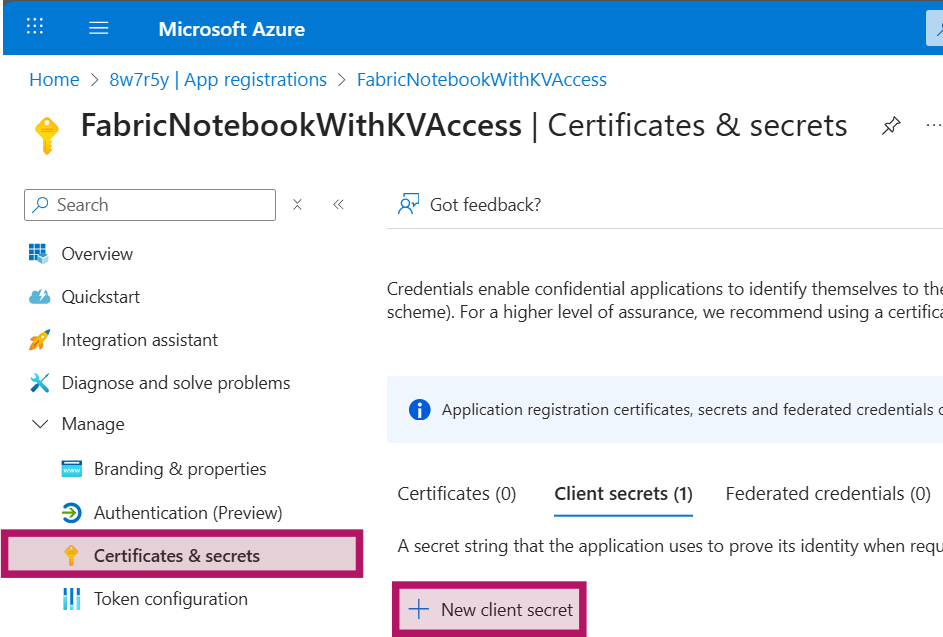 A Service Principal can be created via Powershell or in the Azure Portal. Navigate to portal.azure.com > Entra Portal > App registrations. Click on “New registration”, set a descriptive name such as “FabricNotebookWithKVAccess” and click on “Register”.