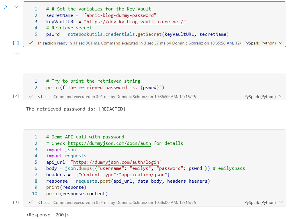 The code assumes that your Key Vault contains a secret “fabric-blog-dummy-password” with the value “emilyspass”. Add this secret if you want to test the provided code.