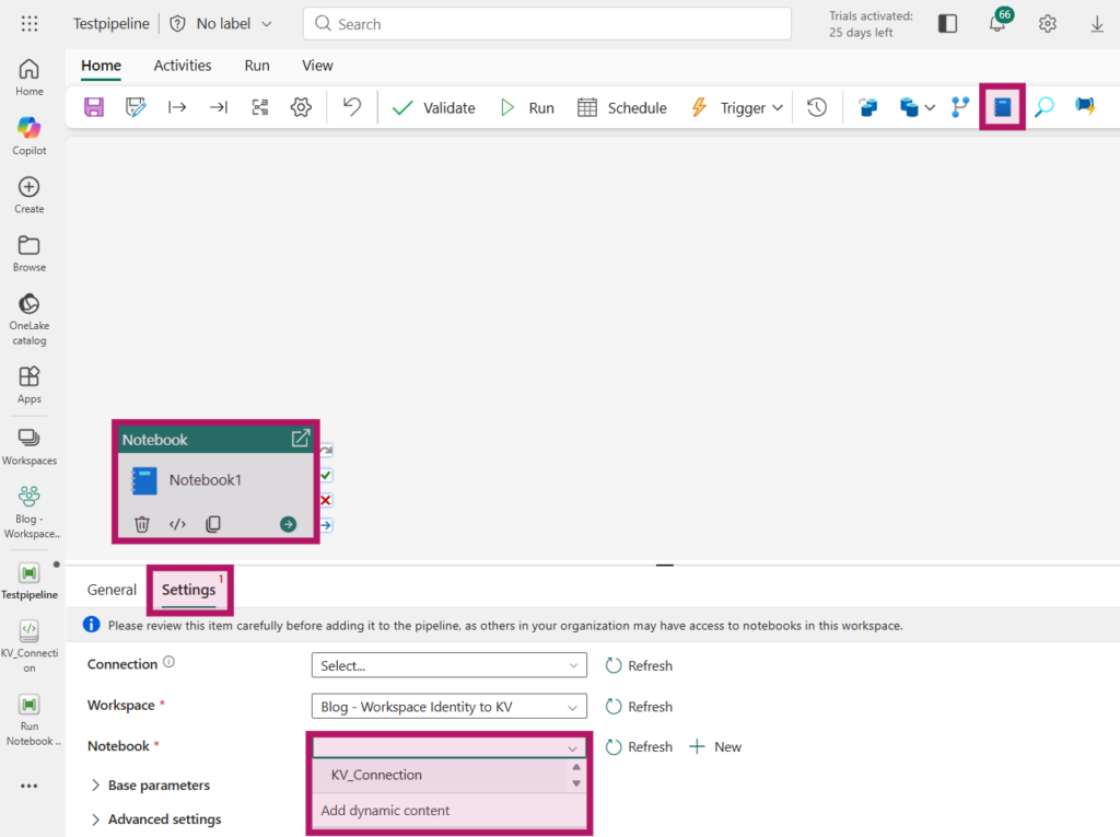 In the newly created Pipeline, select the Notebook activity and on the activity, navigate to “Settings” and select the Notebook containing the code to access the Key Vault.