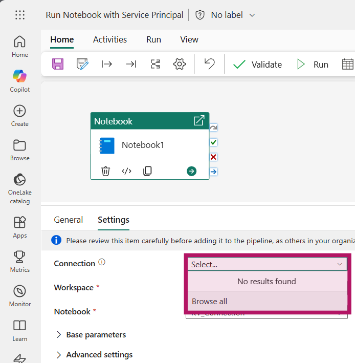 On the Notebook activity, select the Connection property and click on “Browse all”