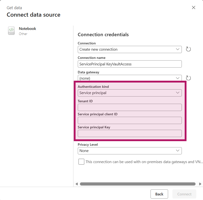 Select “Notebook” from the new sources and provide the details of your Service Principal. Tenant ID and service principal client ID can be found on the Service Principal on the overview page. The “Service principal Key” is the secret you created in the Set Up earlier. Click “Connect” in the bottom right after providing the details.