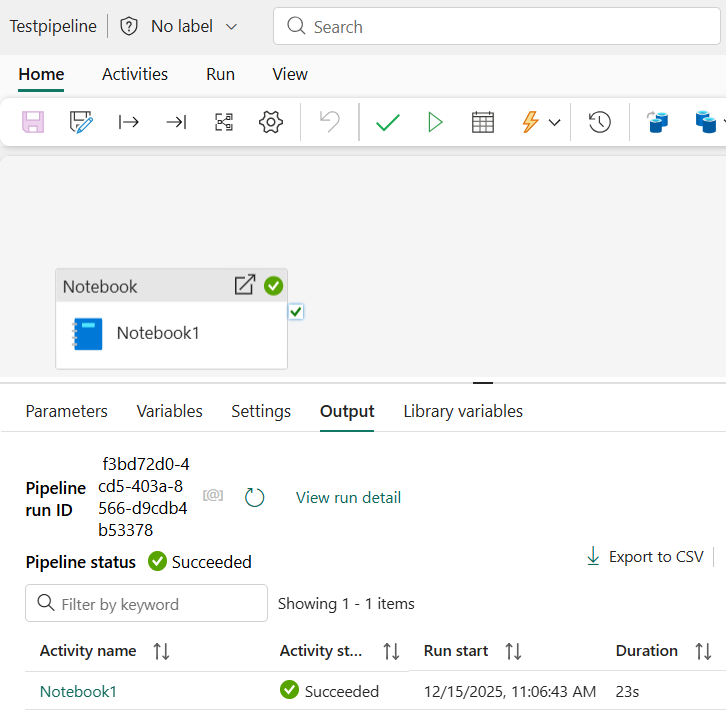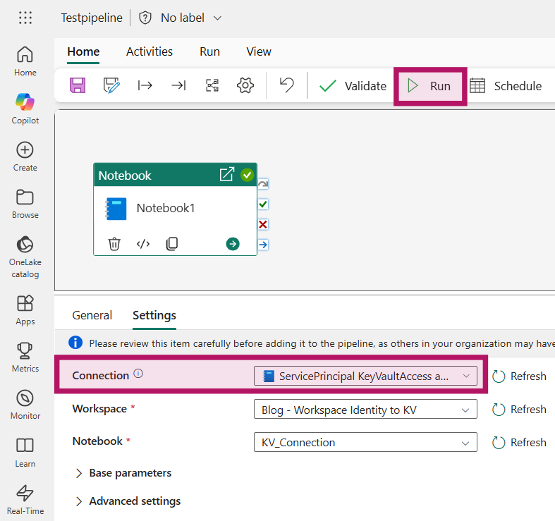 Ensure the connection is correctly set on the Notebook activity and run the Pipeline.