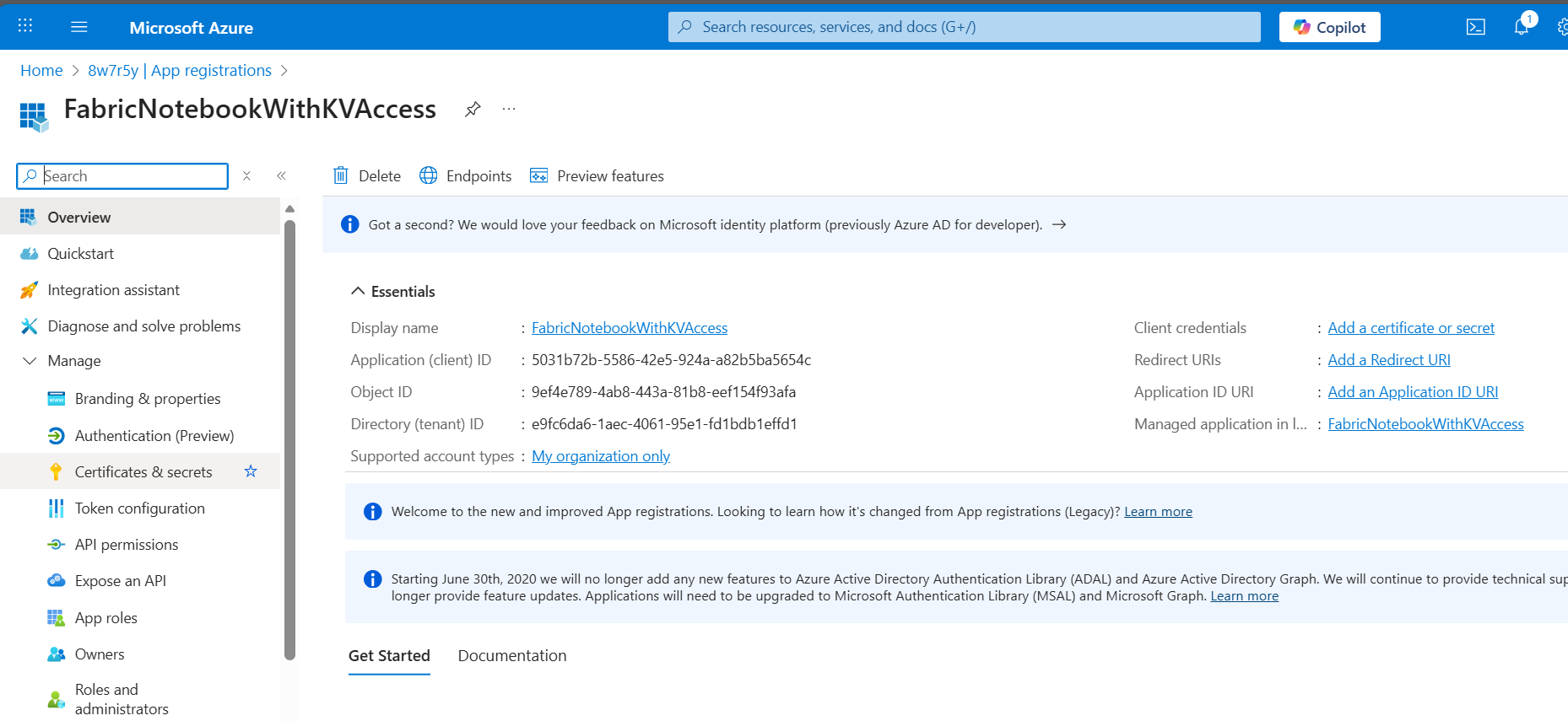 In the overview page after adding the Service Principal you can see the Application (client) ID and the Directory (tenant) ID. These will be needed later.