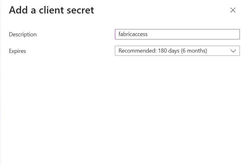 After creating the Service Principal, the next step is to set up a client secret. On the Service Principal, navigate to “Certifactes & Secrets” and press the button to add a new client secret. Give the secret a name and set the expiration days.