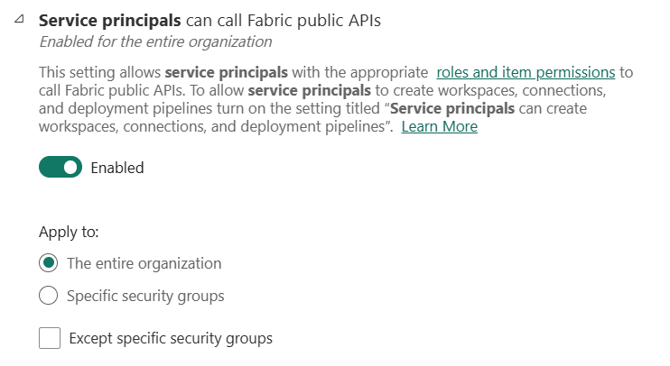 - Admin Setting “Service Principals can call Fabric public APIs”